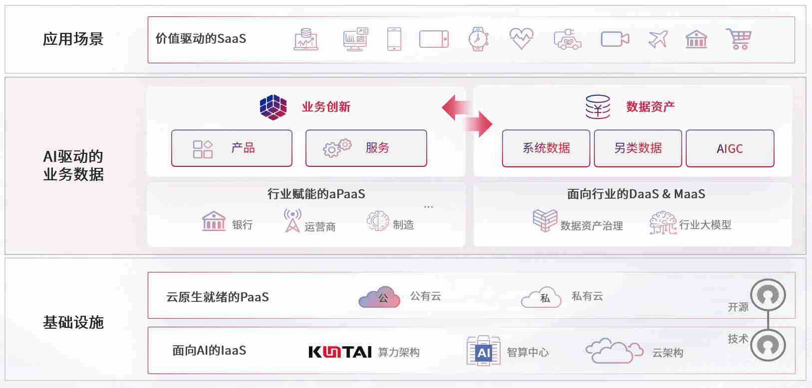 数字时代,,围绕企业数字化转型的关键要素,,KOO钱包数码开创性的提出数云融合战略和技术体系框架,,,着力在云原生、、、、数字原生、、、、AI原生和信创产业上架构产品和服务能力,,,,为处在不同数字化转型阶段的快消零售、、汽车、、金融、、、、医疗、、、政企、、教育、、运营商等行业客户提供泛在的敏捷IT能力和融合的数据驱动能力,,构建跨界融合创新的数字业务场景和新业务模式,,,,助力企业级客户建立面向未来的核心能力和竞争优势,,,全面推动社会的数字化、、、、智能化转型升级。。
